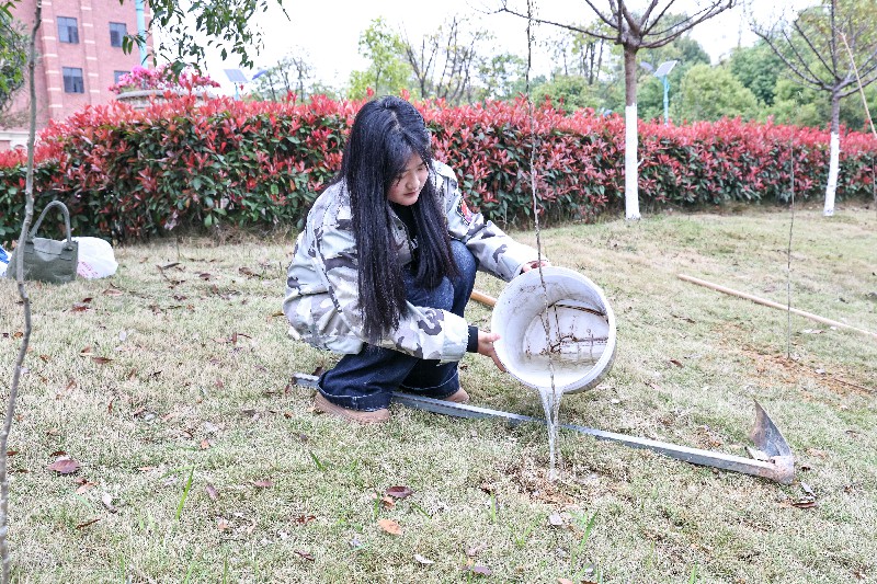 活動(dòng)現(xiàn)場(chǎng),春雨如絲,潤(rùn)物無聲。黨委委員石慧與譚聰書記率先垂范,帶領(lǐng)師生們手持鐵鍬、水桶等工具,迅速投入到熱火朝天的植樹勞動(dòng)中。大家分工協(xié)作、默契配合——揮鍬挖坑、扶苗定植、培土圍堰、提水澆灌,每一道工序都一絲不茍、井然有序。綿綿細(xì)雨滋潤(rùn)著大地,也為新栽的樹苗帶來了天然的甘露。黨員教師們以身作則,邊勞動(dòng)邊向?qū)W生志愿者講解植樹要領(lǐng),傳授勞動(dòng)技能;志愿者們熱情高漲、干勁十足,在老師的帶領(lǐng)下認(rèn)真完成每一株樹苗的栽種。雨中的勞動(dòng)場(chǎng)景更顯生動(dòng),經(jīng)過近兩個(gè)小時(shí)的辛勤勞作,一株株新栽的樹苗在雨中昂首挺立、錯(cuò)落有致,為初春的夢(mèng)想花園增添了勃勃生機(jī),也為美麗校園建設(shè)貢獻(xiàn)了一份力量。