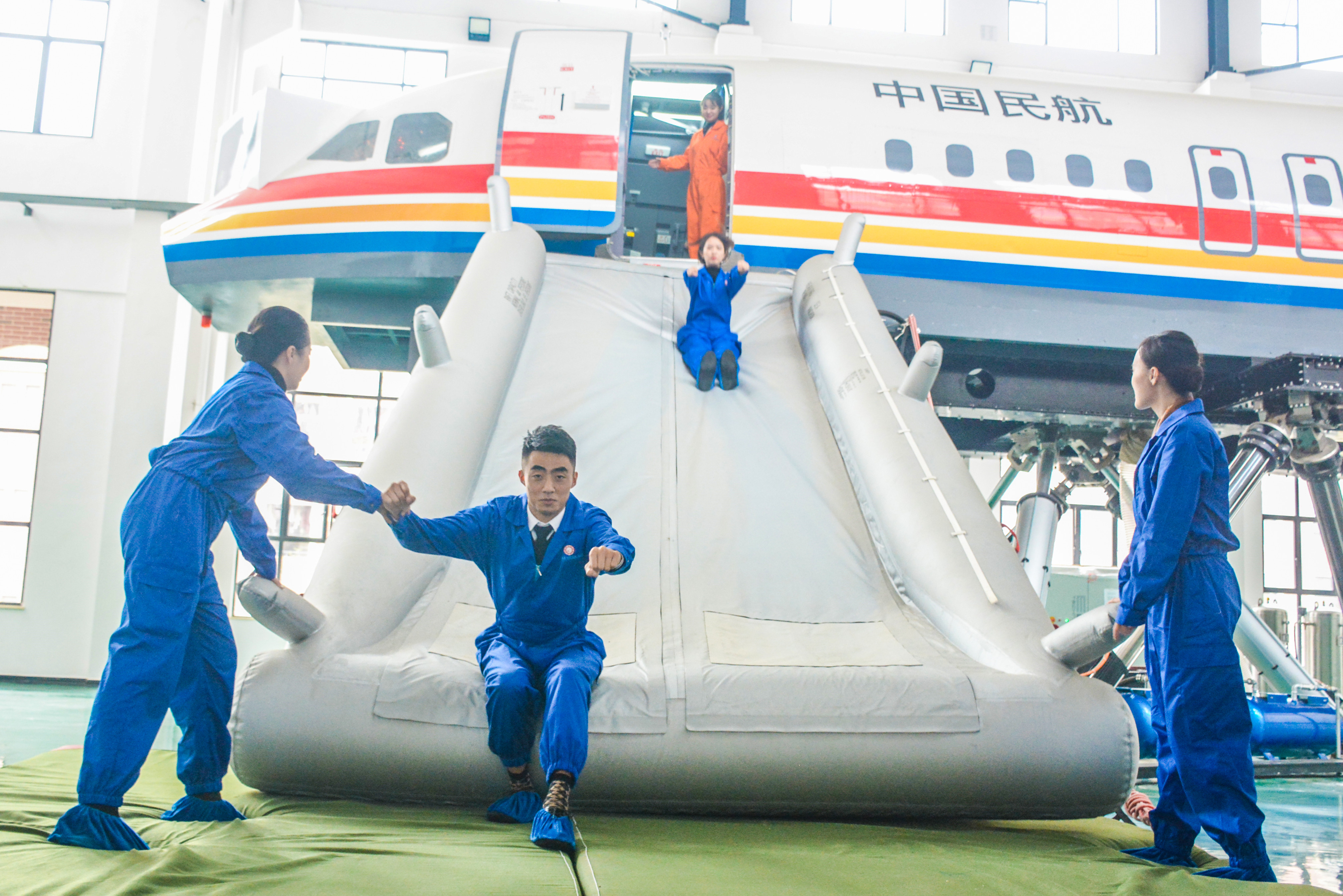 其次,還有應(yīng)急撤離的實訓(xùn)。比如在緊急情況下正確開啟或關(guān)閉飛機艙門的操作技能,它主要包括測試、安全和應(yīng)急撤離等功能。由于我院實訓(xùn)艙艙門是由實體機型搬運組裝而成,所以同學(xué)們能夠體驗到真實飛機機應(yīng)艙門的多種功能與外觀感受,包括滑梯充氣模擬系統(tǒng)、登機門故障模擬系統(tǒng)和門外視景模擬系統(tǒng)等。