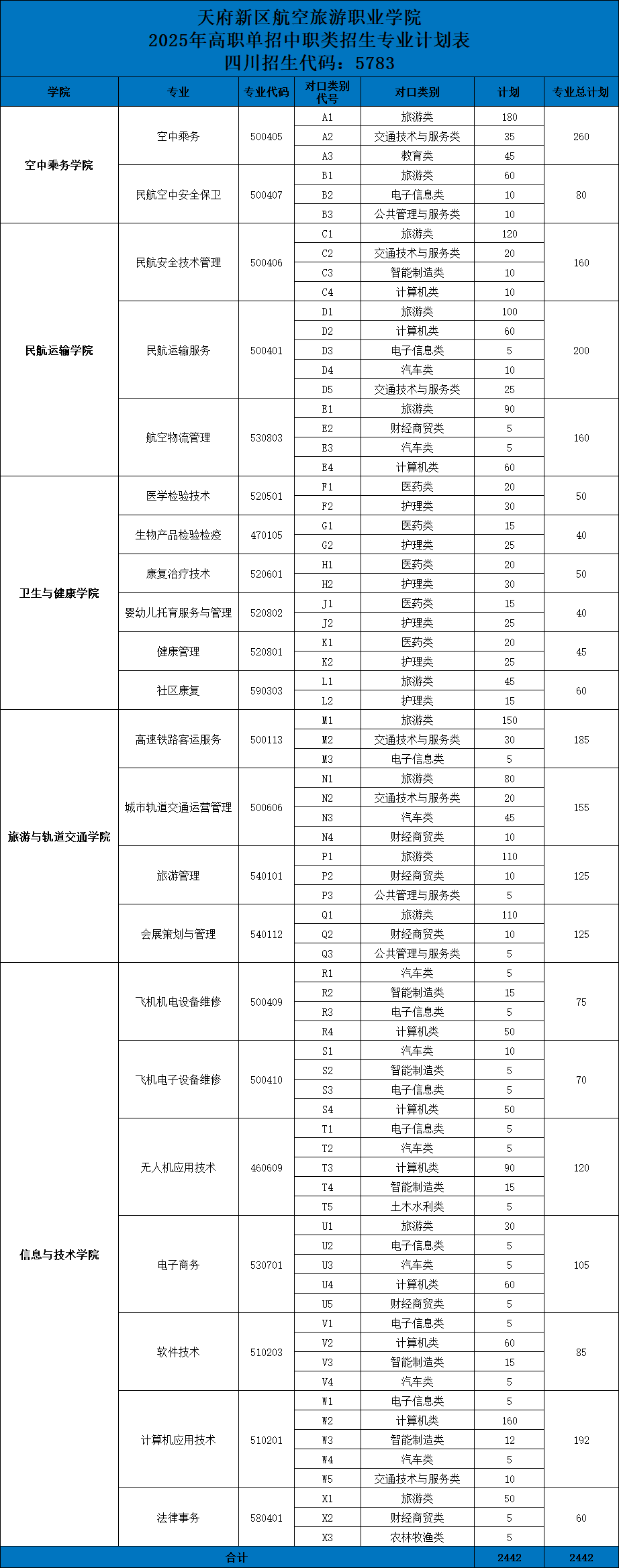 天府新區(qū)航空旅游職業(yè)學(xué)院2025年高職單招招生專業(yè)及計劃表